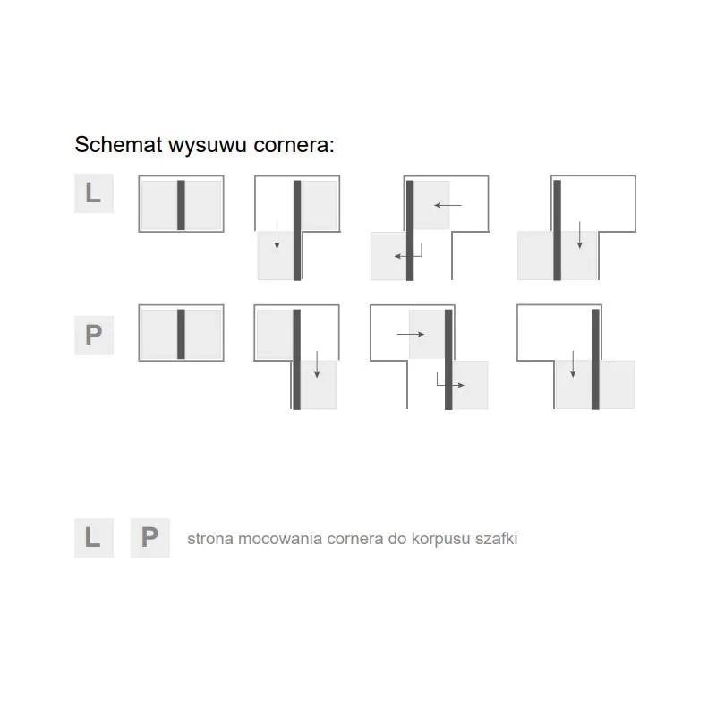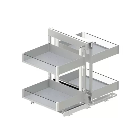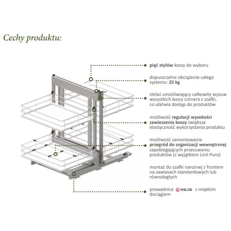 Narożny kosz cargo "CORNER COMFORT" to rozwiązanie które pozwala na wygodne zagospodarowanie narożnej szafki kuchennej. Dwie półki wysuwają się całkowicie poza szafkę co zapewnia swobodny dostęp do przedmiotów w niej schowanych. Konstrukcja pozwala dociążyć się przedmiotami o wadze łącznej do 25kg. Cargo CORNER COMFORT firmy Rejs cechuje się wyjątkowo prostym montażem, w przeciwieństwie do konkurencyjnych rozwiązań koszy montowanych uniwersalnie na stronę prawą oraz lewą.