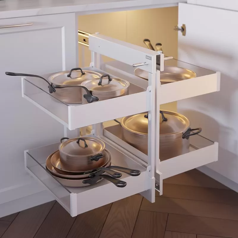 Niewykorzystana przestrzeń w kuchennych szafkach narożnych nie będzie już problemem. Dzięki serii koszy Magic Corner dostęp do tej zwykle niewykorzystanej przestrzeni jest możliwy i zarazem bardzo wygodny. W ofercie naszej hurtowni posiaddamy wiele typów koszy cargo oferujących różny design, pasujący do różnej wielkości korpusów oraz frontów meblowych, a także posiadających różne wykończenie oraz zastosowane mechanizmy. Oferowane przez nas kosze posiadają gwarancję producenta, są to sprawdzone produkty, niejednokrotnie wykorzystywane w kuchniach naszych klientów już od wielu lat.