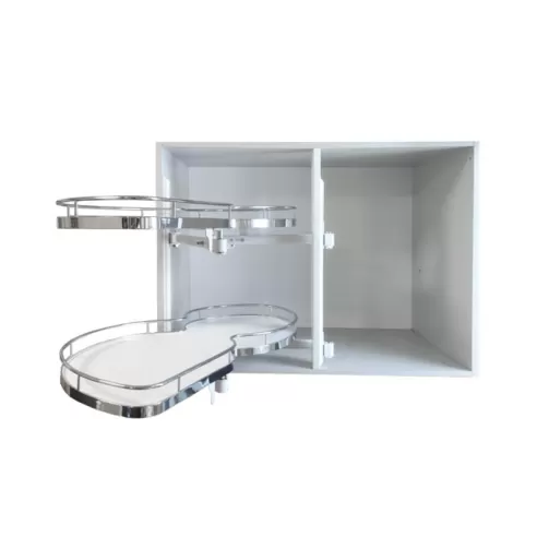 Narożny kosz cargo „nerka" to rozwiązanie które pozwala na wygodne zagospodarowanie narożnej szafki kuchennej. Dwie półki wysuwają się całkowicie poza szafkę co zapewnia swobodny dostęp do przedmiotów w niej schowanych. Każda z półek wysuwa się niezależnie, konstrukcja pozwala obciążyć każdą z nich przedmiotami o wadze do 15kg. Ze względu na swoją praktyczność w codziennym użytkowaniu, kosze te stały się najpopularniejszym rozwiązaniem w narożnych szafkach kuchennych.