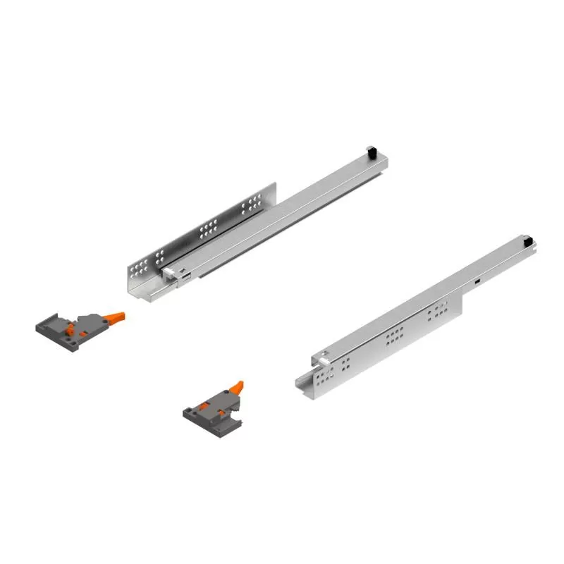 Prowadnica do szuflad drewnianych dolnego montażu z systemem dociągu oraz cichego domyku, pełny wysuw - wersja bez synchronizacji przeznaczona do mniejszych obciążeń (30kg)
