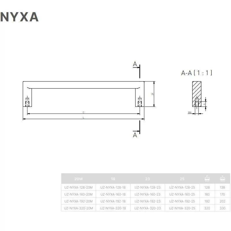 Seria NYXA jest dostępna w czterech rozstawach: 128 mm, 160 mm, 192 mm i 320 mm, co oznacza możliwość dobrania odpowiednio rozmiaru dla potrzeb swoich mebli, oraz w czterech uniwersalnych kolorach: czarnym macie, jasnym graficie, złocie szczotkowanym i kaszmirze umożliwiającymi większą swobodę aranżacji.