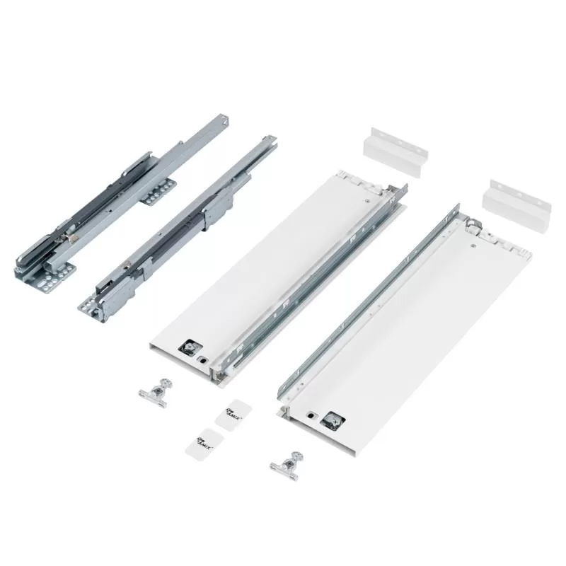 Szuflady ELITEBOX Amix to najnowsze rozwiązanie w dziedzinie szuflad typu slim (slimboxów). Szuflada dostosowana jest do płyty 18mm! Brak konieczności stosowania płyt 16mm przy montażu szuflad to wyjątkowa wygoda. Ograniczenie ilości odpadów, rozpis płyty w jednym rozkroju, możliwość korzystania z mnogości dekorów przy doborze płyty na spód i tył szuflad. Poza tym wyjątkowym aspektem szuflady Elitebox charakteryzuje wyjątkowo cicha praca SYNCHRONIZOWANEGO systemu jezdnego oraz siatka wymiarów bliźniacza z najpopularniejszymi systemami Blum Tandembox/GTV AxisPro/ Rejs Ultrabox