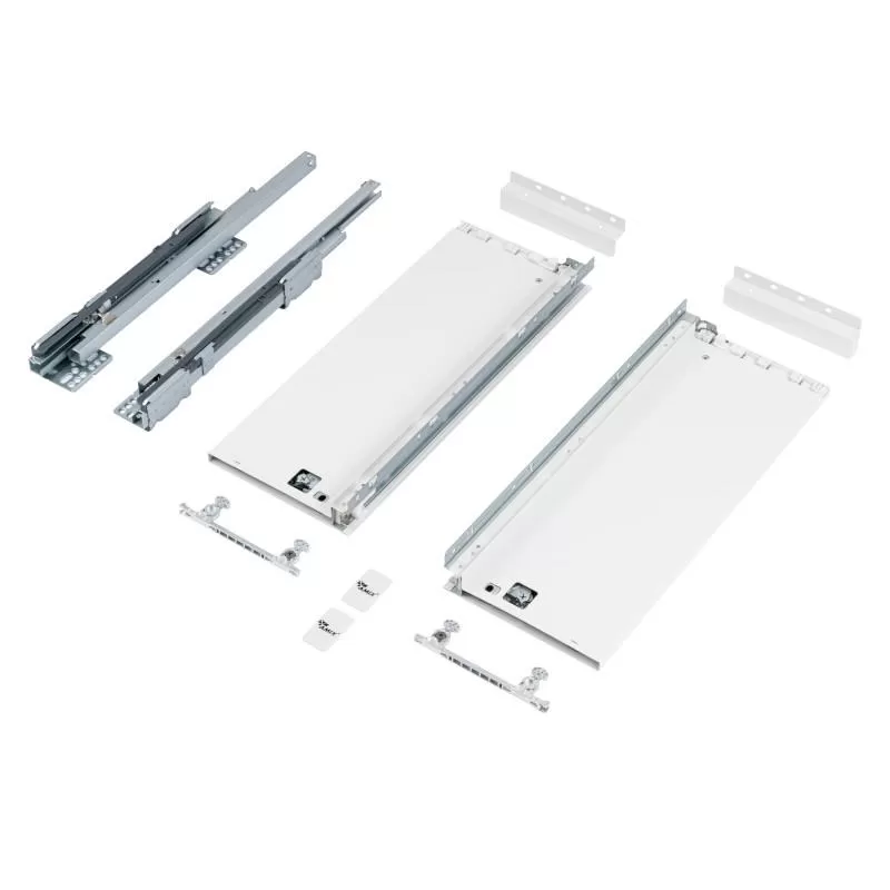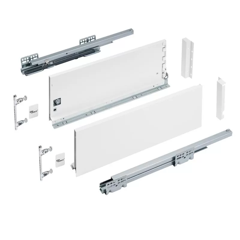 Szuflady ELITEBOX Amix to najnowsze rozwiązanie w dziedzinie szuflad typu slim (slimboxów). Szuflada dostosowana jest do płyty 18mm! Brak konieczności stosowania płyt 16mm przy montażu szuflad to wyjątkowa wygoda. Ograniczenie ilości odpadów, rozpis płyty w jednym rozkroju, możliwość korzystania z mnogości dekorów przy doborze płyty na spód i tył szuflad. Poza tym wyjątkowym aspektem szuflady Elitebox charakteryzuje wyjątkowo cicha praca SYNCHRONIZOWANEGO systemu jezdnego oraz siatka wymiarów bliźniacza z najpopularniejszymi systemami Blum Tandembox/GTV AxisPro/ Rejs Ultrabox