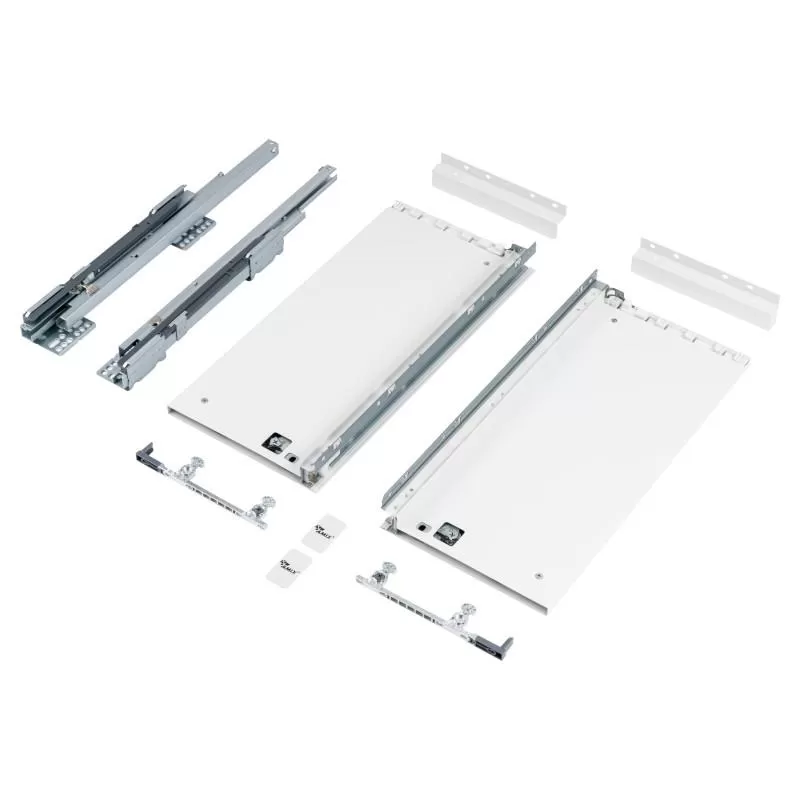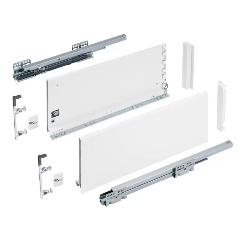 Szuflady ELITEBOX Amix to najnowsze rozwiązanie w dziedzinie szuflad typu slim (slimboxów). Szuflada dostosowana jest do płyty 18mm! Brak konieczności stosowania płyt 16mm przy montażu szuflad to wyjątkowa wygoda. Ograniczenie ilości odpadów, rozpis płyty w jednym rozkroju, możliwość korzystania z mnogości dekorów przy doborze płyty na spód i tył szuflad. Poza tym wyjątkowym aspektem szuflady Elitebox charakteryzuje wyjątkowo cicha praca SYNCHRONIZOWANEGO systemu jezdnego oraz siatka wymiarów bliźniacza z najpopularniejszymi systemami Blum Tandembox/GTV AxisPro/ Rejs Ultrabox