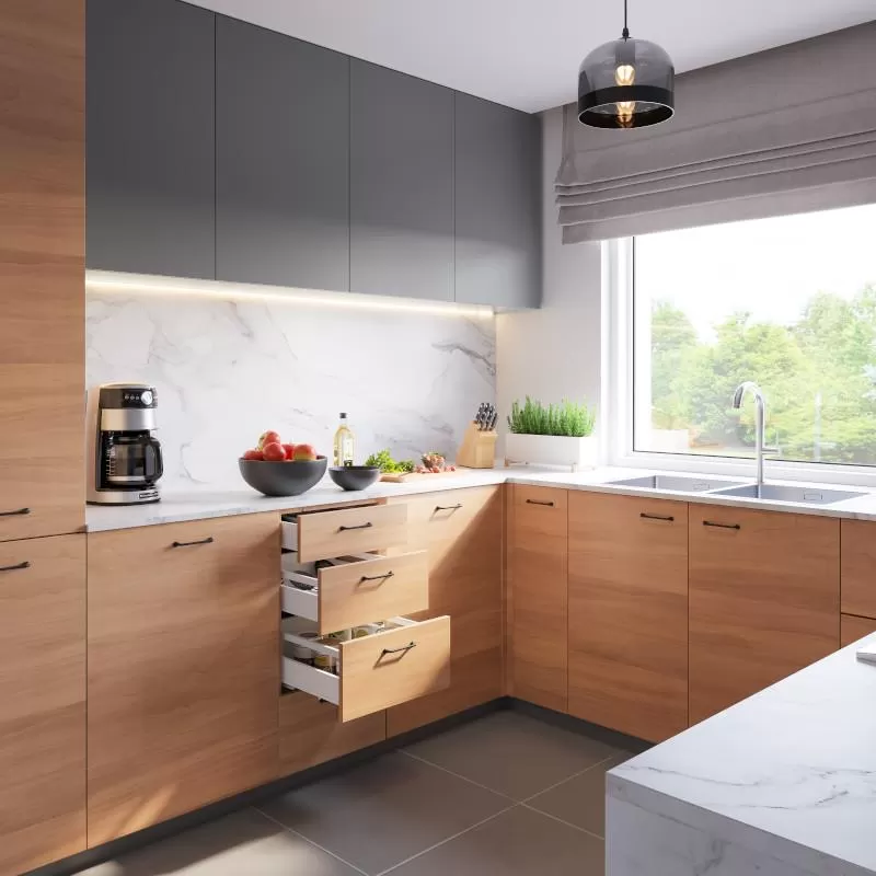 Modern Box Pro to ergonomiczne i nowoczesne rozwiązanie dla każdego rodzaju kuchni. Świetnie sprawdzi się zarówno w małych pomieszczeniach, gdzie liczy się każdy wolny metr, jak w i dużych przestrzeniach, które dają większe możliwości aranżacji. Modern Box Pro to odpowiedź na rosnące potrzeby klientów co do jakości akcesoriów kuchennych i komfortu ich użytkowania. System spełni oczekiwania nawet najbardziej wymagających użytkowników. Nowoczesną szufladę Modern Box Pro certyfikowano na 60 000 cykli. Produkt zapewnia obciążenie do 40 kg. Komfort pracy gwarantuje pełen wysuw w długościach od 300 do 550 mm, mechanizm cichego domyku oraz synchronizacja toru pracy prowadnic. Szuflada występuje w 4 wariantach wysokości (84, 135, 167, 199 mm), zarówno do frontów wpuszczanych, jak i nakładanych. Szufladę łatwo montuje się dzięki regulacji od wewnętrznej strony, jak również zakresowi regulacji pionowej i poziomej w zakresie +- 1,5 mm. Do szuflady pasuje cała gama systemów organizacji przestrzeni, wkładów na sztućce, mat oraz sortowników na odpady.