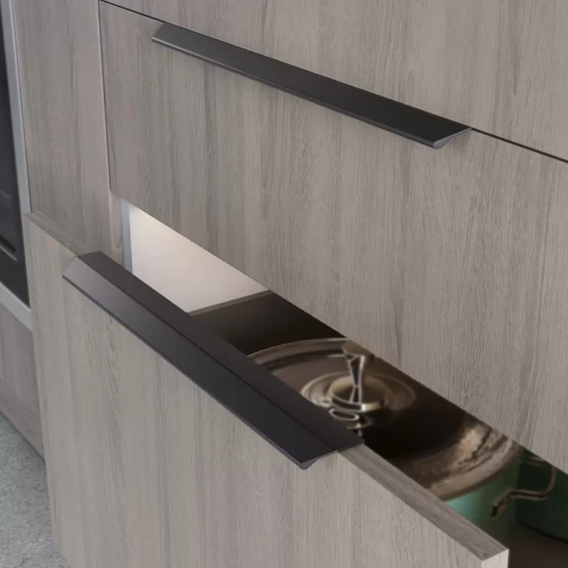 Prosty design uchwytów TREX-CROSS umożliwia subtelne zintegrowanie profilu z frontem mebla. Dzięki temu uchwyty nie dominują nad całością, ale harmonijnie łączą się z designem i stylem mebli, co sprawia, że uchwyt doskonale pasuje do nowoczesnych aranżacji wnętrz, gdzie minimalistyczny wygląd i dyskretne detale są kluczowe.