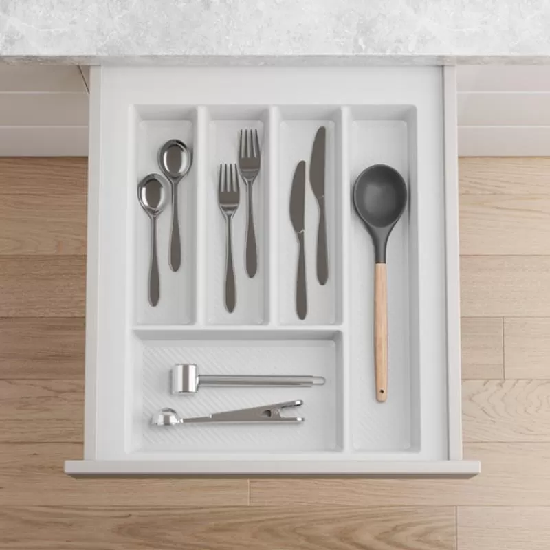 Wkłady wykonane są z tworzywa sztucznego o zwięksoznej grubości. Produkt został zaprojektowany w taki sposób, aby umożliwiał składowanie najbardziej pospolitych przedmiotów kuchennych w szufladzie. Wkłady można dociąć o kilka mm tak aby dopasować je do różnego rodzaju szuflad, zróżnicowanych producentów. Tworzywo na spodach komór jest teksturowane aby niwelować możliwość zarysowań.