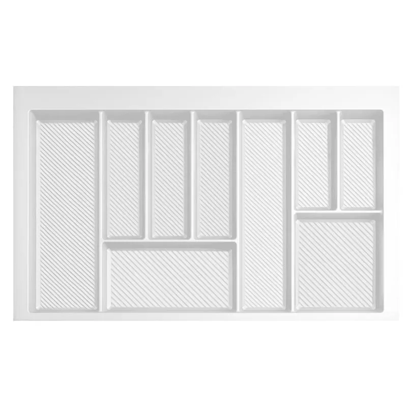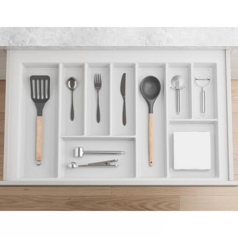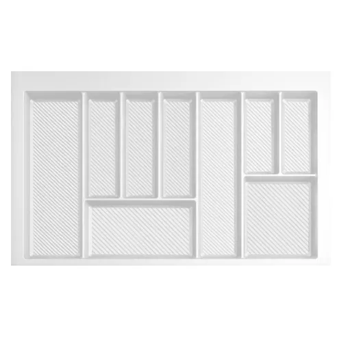 Wkłady wykonane są z tworzywa sztucznego o zwięksoznej grubości. Produkt został zaprojektowany w taki sposób, aby umożliwiał składowanie najbardziej pospolitych przedmiotów kuchennych w szufladzie. Wkłady można dociąć o kilka mm tak aby dopasować je do różnego rodzaju szuflad, zróżnicowanych producentów. Tworzywo na spodach komór jest teksturowane aby niwelować możliwość zarysowań.