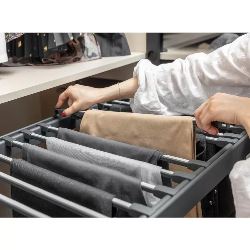 Szuflada ELITE wieszakowa zapewnia miejsce do przechowywania spodni. Jest niezwykle praktyczna za sprawą wielu przegródek. Dostępna w trzech wariantach kolorystycznych oraz czterech wariantach rozmiarowych z możliwością dostosowania szerokości do korpusu. Technologia cichego domyku oraz pełny wysuw ułatwia codzienne użytkowanie szuflady. Zestaw jest wyposażony w dwie sztuki prowadnic dolnego montażu, dwie sztuki osłon prowadnicy, dwie sztuki mocowania kosza, ramę z regulacją szerokości +/- 58 mm, drążki druciane (6, 7, 8, 9 szt. w zależności od rozmiaru) oraz wkręty.