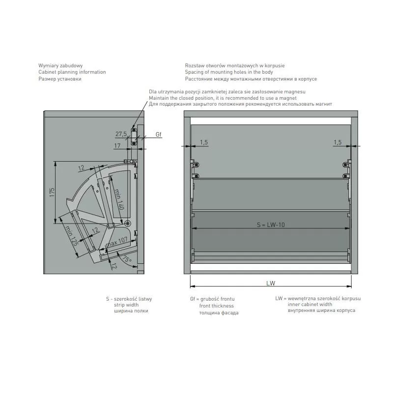 Umożliwia utworzenie półki uchylnej do przechowywania butów. Odpowiedni do płyt o wymiarach 12 mm.